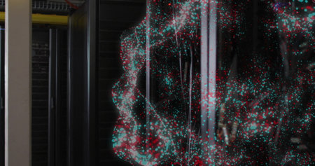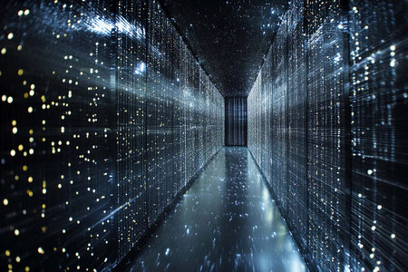 Data stream flowing through server racks in modern data center, representing digital information transfer and processing
