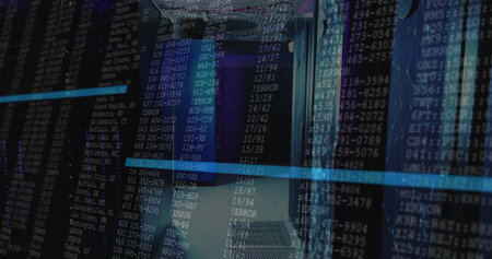 Image of data processing against computer server room. Computer interface and business data storage technology concept