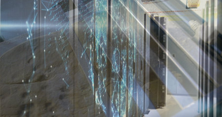 Projecting digital network map across server racks inside data center room, with LED fixtures. Futuristic, technology, cyber, data, infrastructure, connectivity, high-tech