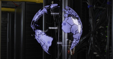 Projecting holographic globe floating in server room, with server cabinets and network cables. Technology, data, innovation, futuristic, cyber, digital, infrastructure