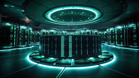 Futuristic server room with bright neon lights.