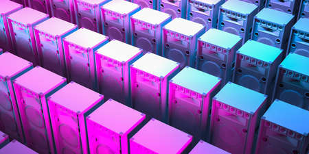 several powerful loudspeakers close-up in neon lighting, 3d illustration