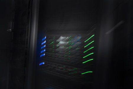 server room or data center supercomputer technology equipment, abstract close up of a server rack with motion blur.