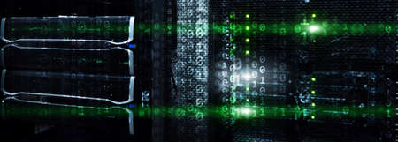 Modern interior server room data center. Connection and cyber network in dark servers. Backup, mining, hosting, mainframe, farm, cloud and computer rack with storage information. 3d rendering