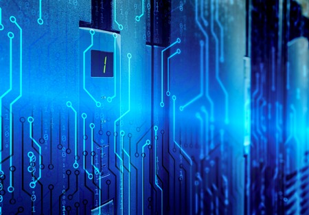 Neon blue microprocessor connections against computer server room in background. cyber security and data storage technology concept