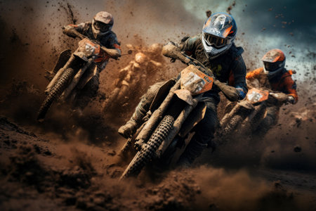 Dynamic image of motocross riders racing through muddy terrain, splashing dirt