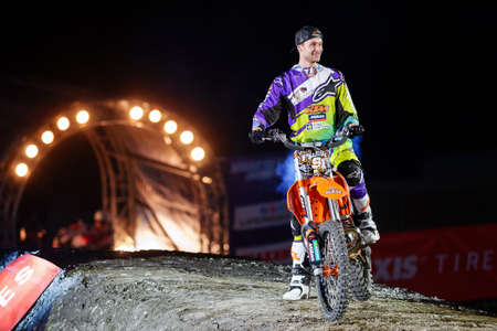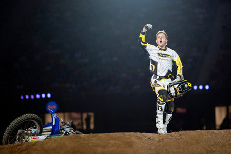 POZNAN, POLAND - AUGUST 6: A professional rider at the FMX Freestyle Motocross competition at Red Bull X-Fighters, 2011.
