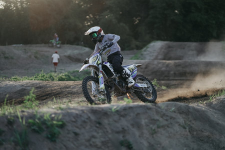 Ukraine, Kyiv, 06.06.2020. First step Golosievo-MX Pyrohiv-Kyiv Extreme Motocross MX Rider riding on dirt track. athletes children, juniors, men, women
