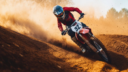 A motocross rider executes an impressive jump over a dirt track, creating a cloud of dust in the golden light of sunset. The dynamic shot captures the energy of the moment.