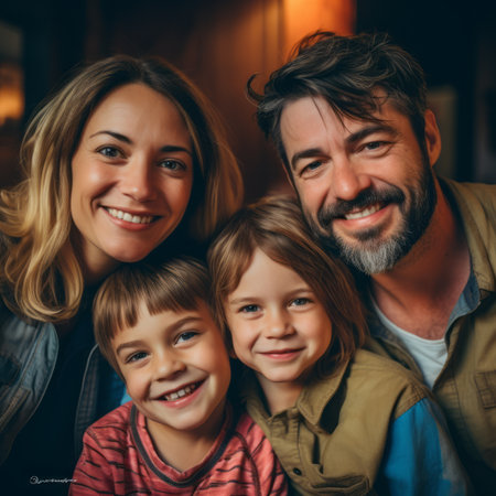 A family portrait featuring four members: two adults and two children, all smiling and dressed in brown tones, with a soft light illuminating their faces