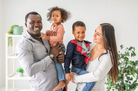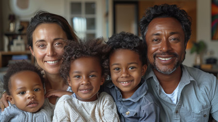 Heartwarming portrait of a diverse family smiling warmly in a welcoming indoor environment.
