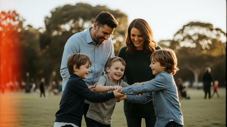 Happy family enjoying time together at sunset in a warm outdoor setting