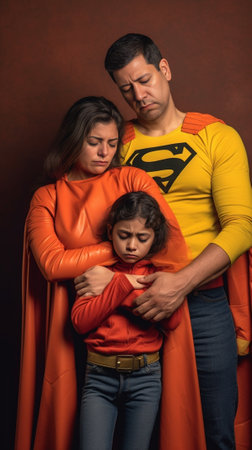 Young family in red and blue suits of superheroes. Their faces in masks and they are in raincoats.