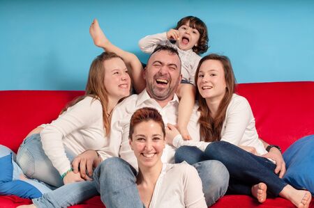 Portrait of a happy family sitting on sofa at home and laughing
