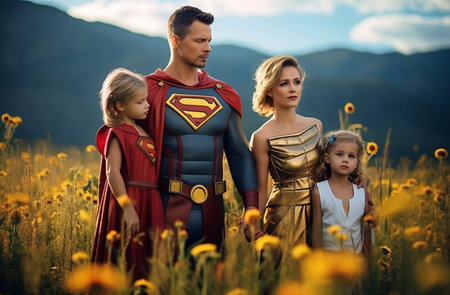 A Family of Superheroes United in Strength and Courage Against a Beautiful Sunset Background.