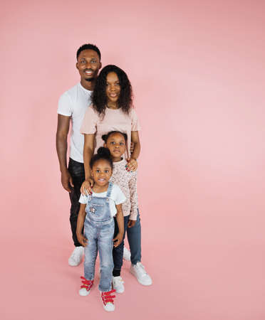 Cheerful african american family of four, standing one behind other and smiling at camera on pink background, banner, free space.