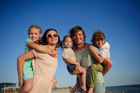 Big happy family walking at the beach. Mom, dad and three children. The blue sky, the sun, fresh sea wind. Pleasure from nature and communication.