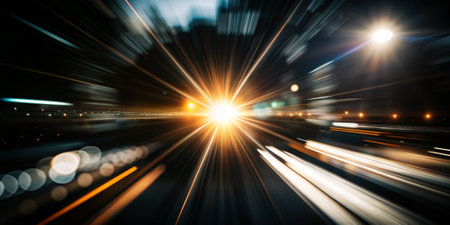 Experience the exhilarating energy of a vibrant city at night with this dynamic image showcasing blurred lights and a futuristic skyline.