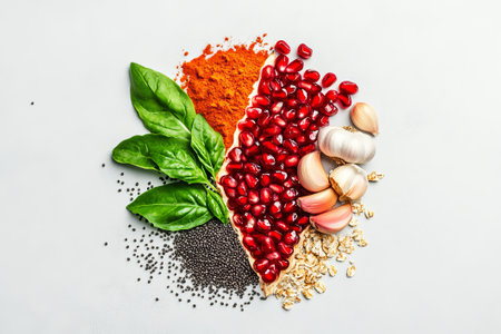 Assortment of vibrant spices and ingredients featuring pomegranate seeds, garlic, basil leaves, and oats ideal for healthy cooking
