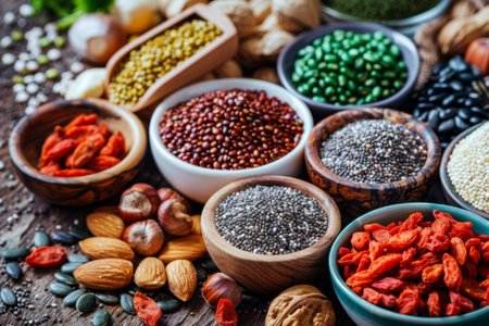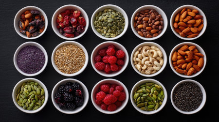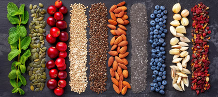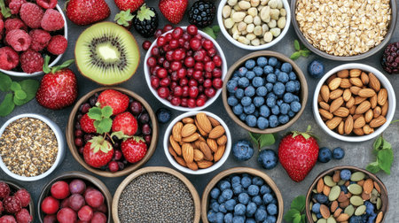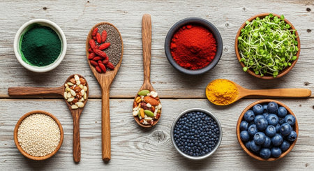 Colorful assortment of healthy food ingredients arranged beautifully, featuring nuts, seeds, berries, and greens, perfect for promoting wellness and culinary artistry.