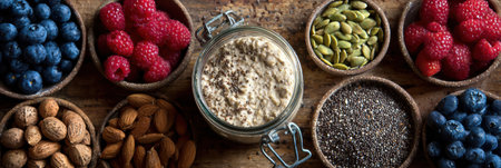 This visually stunning arrangement of nutritious ingredients features oats, nuts, berries, and various powders, beautifully showcasing their textures and colors on a dark wooden surface. Perfect for promoting healthy eating and meal prep ideas.