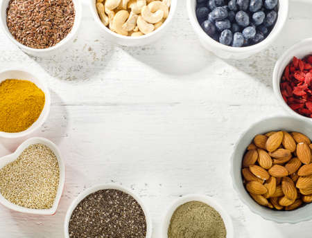 Healthy food clean eating selection on light background. Balanced diet concept. Superfood assortment. Top view, flat lay, copy space