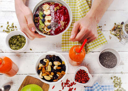 Breakfast with berries smoothies and superfoods. Healthy eating concept. Top view