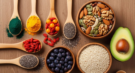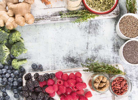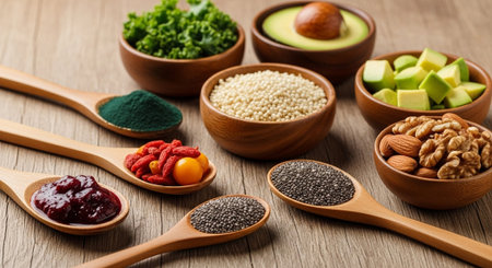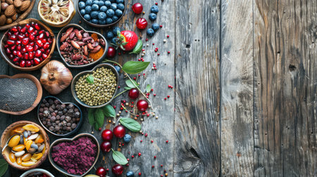 Superfoods boosting immune system, rich in antioxidants, vitamins, minerals, omega-3 fatty acids on wooden table