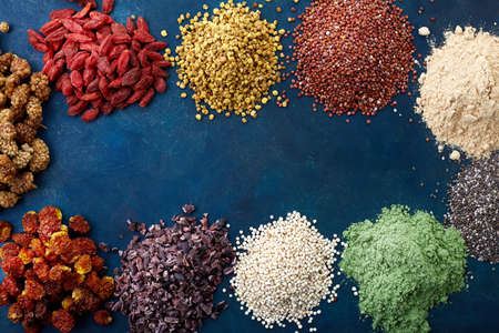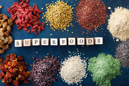 Various superfoods in smal bowl gray concrete background. Superfood as chia, spirulina, raw cocoa bean, goji, hemp, quinoa, bee pollen, black sesame, turmeric. Copy space for text.