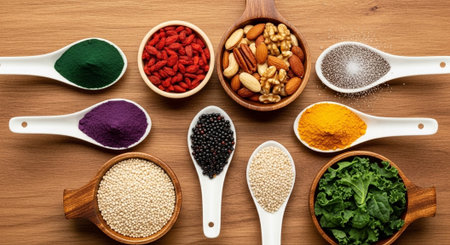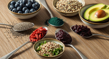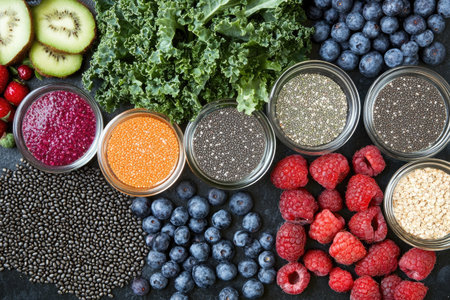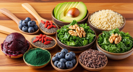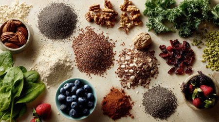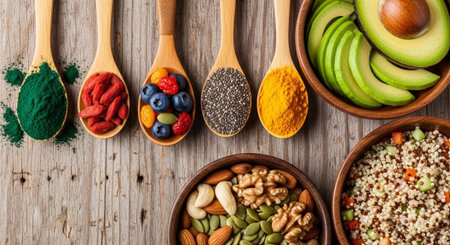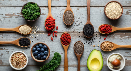 A colorful spread of nutrient-packed superfoods like kale, quinoa, chia seeds, and fresh berries, showcasing balanced nutrition options.