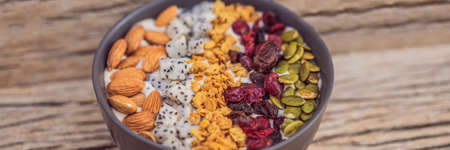 Mango smoothies bowl with almond, dragon fruit, dried cherries, pumpkin seeds and granola on wooden background BANNER, LONG FORMAT