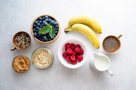 Banana and berry smoothie ingredients made from fresh banana, blueberry, raspberry, milk, peanut butter, chia seeds, almond flakes. Top view