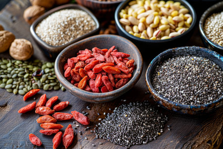 Assortment of superfoods in wooden bowls, including seeds and goji berries.
