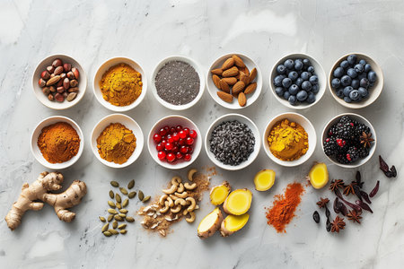 Vibrant collection of nutrient rich superfoods, seeds, and spices meticulously arranged in glass jars on a light marble background, perfect for healthy living themes