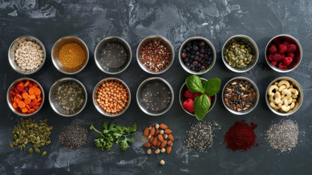 Superfoods Assortment on Dark grey Surface, Variety of healthy superfoods, nuts, seeds, fruits, and greens