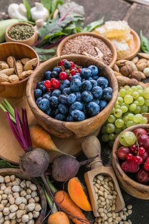 Healthy food selection on wooden background. Balanced diet concept. Selective focus.