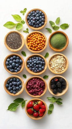 A stunning overhead view of various fresh berries, colorful spices, and natural ingredients arranged in stylish bowls on a textured surface, ideal for culinary creativity.