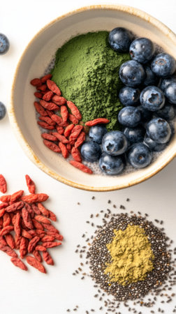 Bowl of fresh blueberries, chia seeds, and goji berries as a healthy breakfast, AI generated