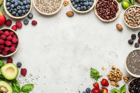 A stunning overhead view of fresh berries, spinach, and chia seeds arranged artfully on a light marble surface, representing vibrant and healthy culinary choices for nutritious meals.