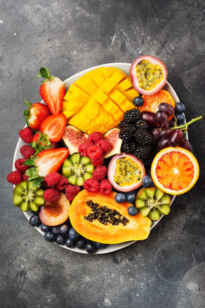 Delicious fruit platter mango papaya oranges passion fruits berries on oval serving plate on dark concrete background, overhead view, selective focus, copy space