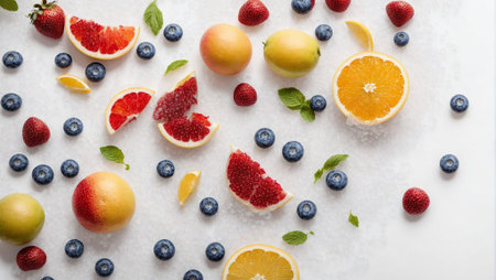 A vibrant flat lay of assorted fresh fruits including mango, berries, grapefruit, and lemon, perfect for promoting healthy eating, fresh flavors, and colorful presentations.
