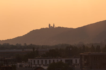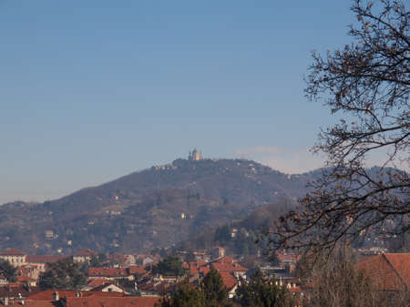 View of the hills surrounding the city of Turin, Italy with the Basilica di Superga baroque church on top of the hill