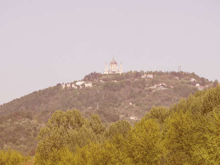 Vintage looking View of the hills surrounding the city of Turin, Italy with the Basilica di Superga baroque church on top of the hill
