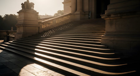 A wide view of grand stone steps leading up to a classical building entrance, bathed in warm sunlight. The strong lighting creates dramatic diagonal shadows across the staircase, highlighting the architectural grandeur.