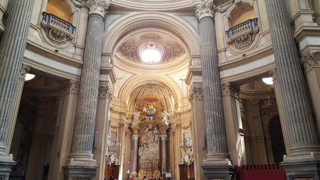 A majestic view of the interior of the Superga Basilica, showcasing its grand Baroque architecture, intricate details, and soaring columns. High quality photo