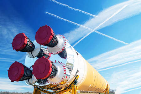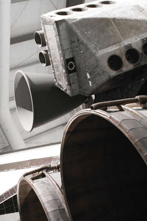 Spaceship rocket boosters close up and isolated against a black background
