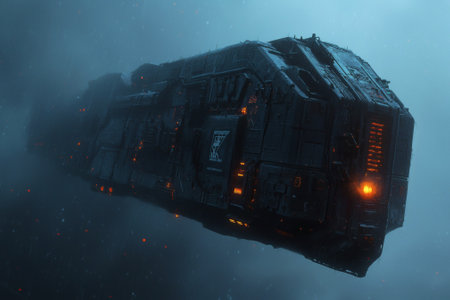 A colossal spacecraft glides silently through a dense haze of cosmic fog, emanating dim orange lights against the dark backdrop of space, evoking a sense of exploration and isolation.