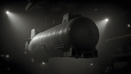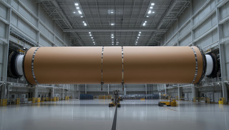 Giant Cylindrical Structure Suspended in Industrial Facility. Aerospace Engineering Marvel.