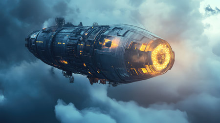 A colossal spaceship descends onto a landing pad, its glowing engines illuminating the twilight scene as onlookers stand in awe, signifying an advanced spacefaring civilization.. AI Generation