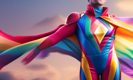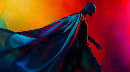 A heroic figure draped in a vibrant cape, silhouetted against an explosion of colorful light, symbolizing power and inspiration.